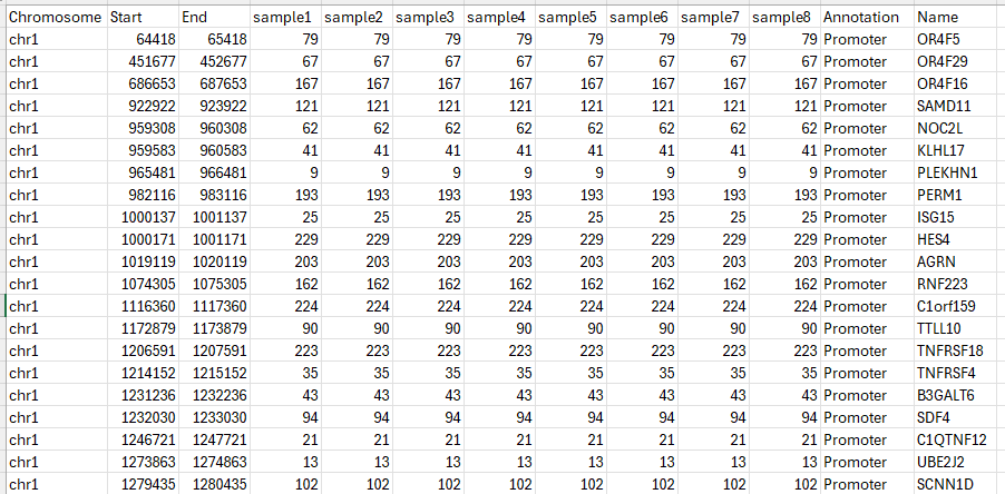 Figure 16 Snapshot of the output tsv.gz for 8 samples, showing the number of CpGs per promoter region with coverage ≥5.#