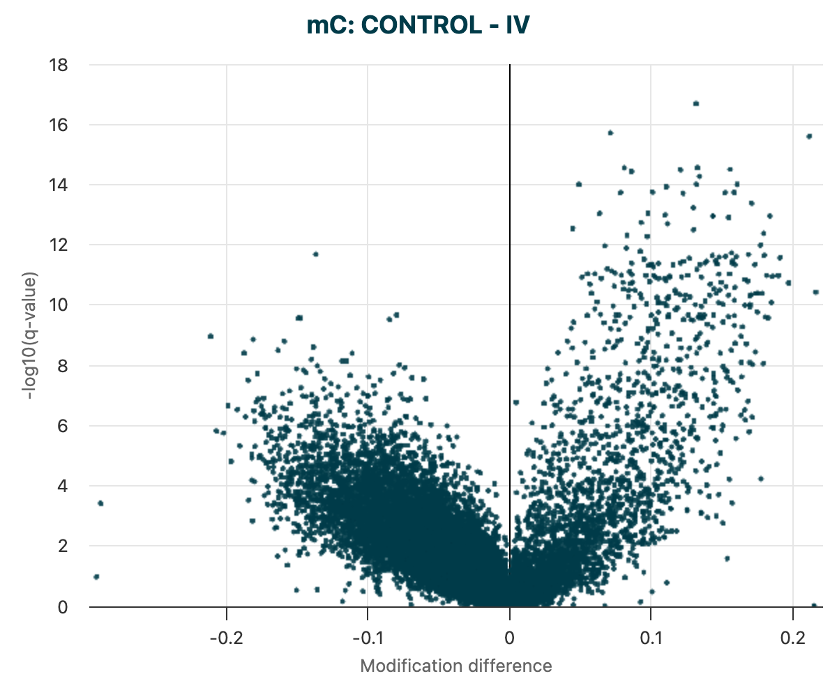 modality dmr call.View DMR results in a volcano plot, apply filters and identify regions with significant hypo-methylation in Stage IV cfDNA compared to Healthy Controls, using