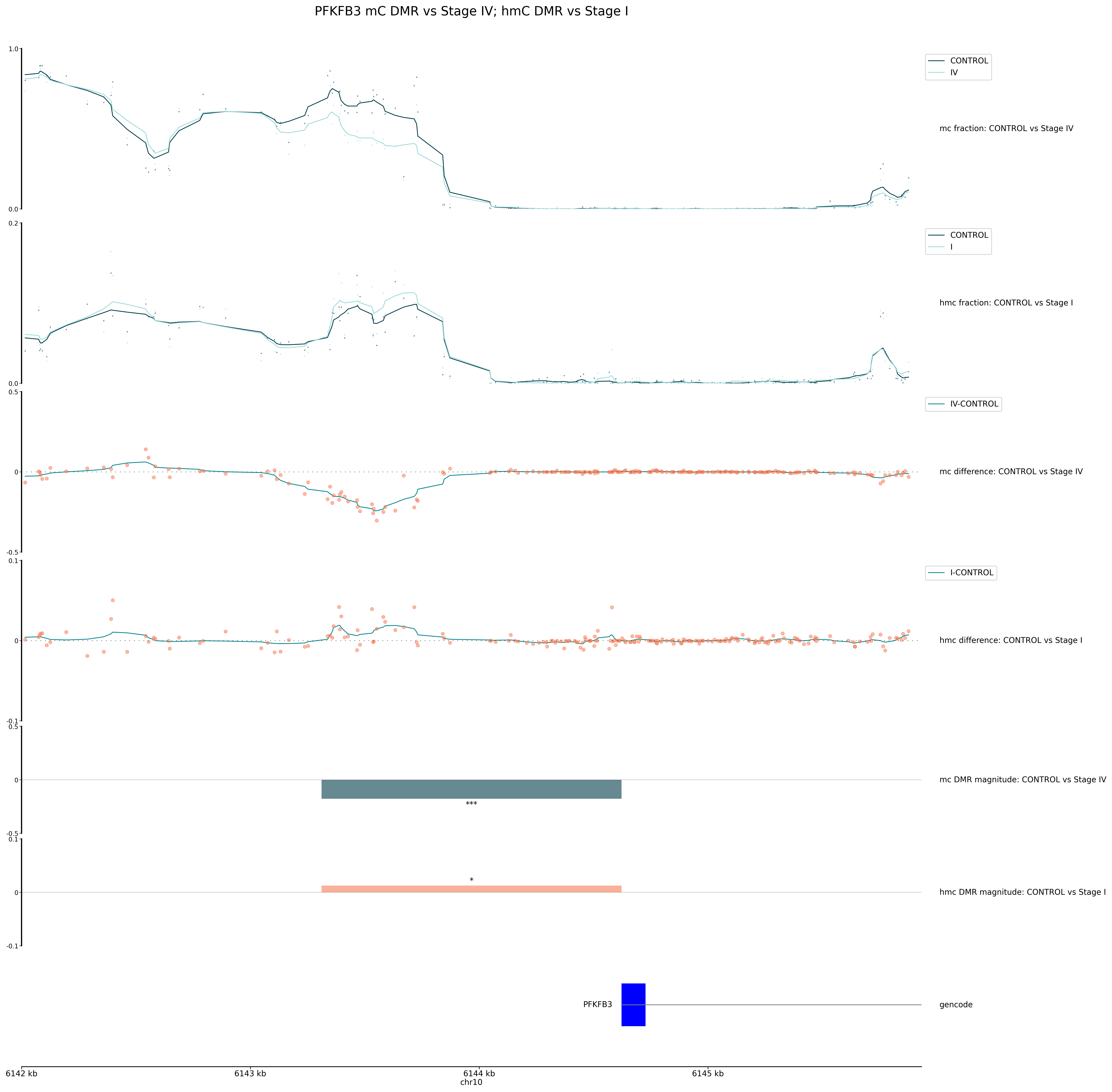 This helps to quantify the relative difference of methylation changes between groups. Note the difference in y-axis scale between the two tracks, as the 5mC hypo-methylation in Stage IV is much greater than the 5hmC hyper-methylation in Stage I.