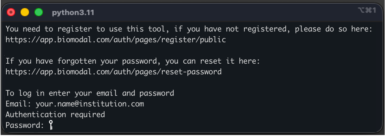 Upon first use of running any modality command, you will be prompted to authenticate your installation with an e-mail address and password.